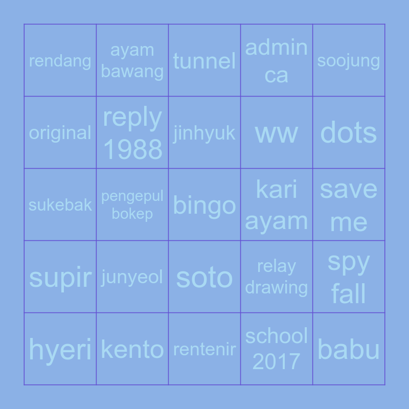 This bingo card has a free space and 24 words: junyeol, kento, jinhyuk, hyeri, soojung, rendang, original, ayam bawang, kari ayam, soto, ww, sukebak, relay drawing, spy fall, reply 1988, school 2017, save me, tunnel, dots, pengepul bokep, babu, supir, admin ca and rentenir.