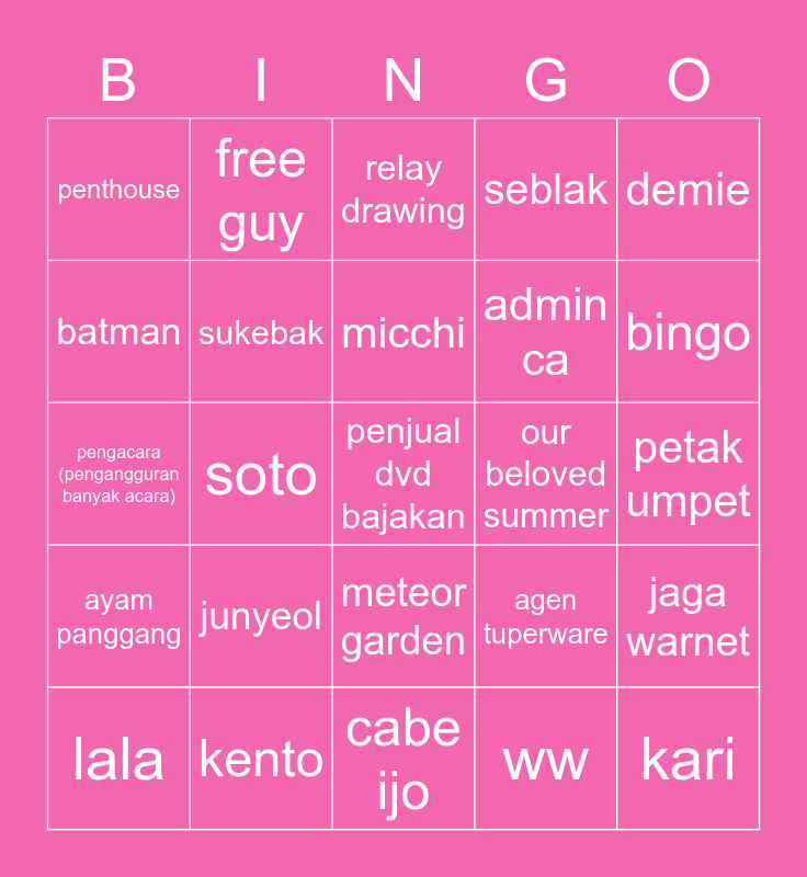 This bingo card has a free space and 24 words: junyeol, kento, micchi, lala, demie, penthouse, batman, free guy, our beloved summer, meteor garden, admin ca, pengacara (pengangguran banyak acara), agen tuperware, jaga warnet, sukebak, ww, petak umpet, relay drawing, bingo, soto, kari, ayam panggang, seblak and cabe ijo.