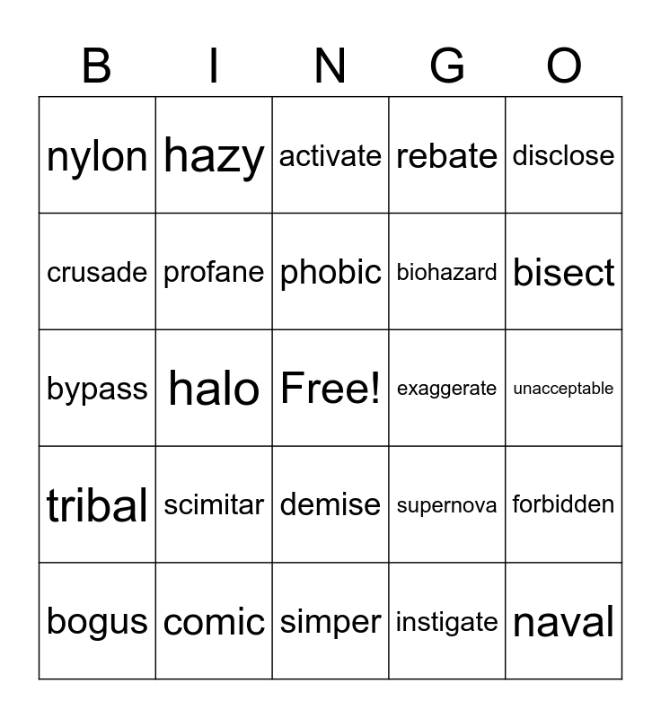 This bingo card has a free space and 24 words: bogus, scimitar, phobic, instigate, disclose, nylon, hazy, activate, exaggerate, unacceptable, bypass, profane, supernova, forbidden, crusade, comic, simper, rebate, bisect, tribal, halo, demise, biohazard and naval.