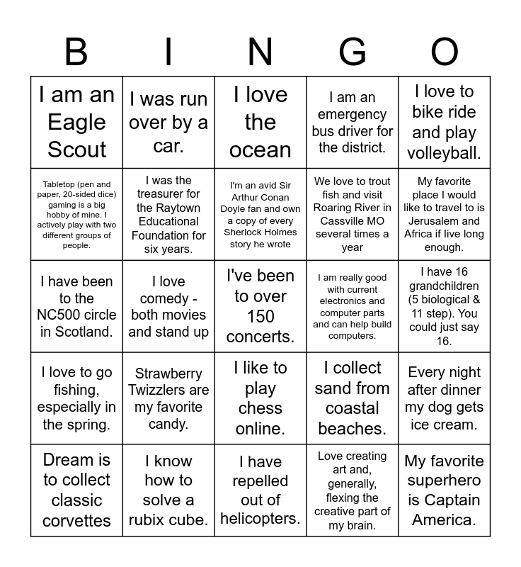 This bingo card has 28 words: Every night after dinner my dog gets ice cream., My favorite artist is Bob Ross., We love to trout fish and visit Roaring River in Cassville MO several times a year, Love creating art and, generally, flexing the creative part of my brain., Tabletop (pen and paper, 20-sided dice) gaming is a big hobby of mine. I actively play with two different groups of people., I love the ocean, I was run over by a car., I love to go fishing, especially in the spring., I am really good with current electronics and computer parts and can help build computers., Dream is to collect classic corvettes, I have been to the NC500 circle in Scotland., I am an emergency bus driver for the district., I know how to solve a rubix cube., I have repelled out of helicopters., My favorite place I would like to travel to is Jerusalem and Africa if Iive long enough., I'm quiet and shy but once you're in I can be obnoxious and silly., Strawberry Twizzlers are my favorite candy., I was the treasurer for the Raytown Educational Foundation for six years., I'm an avid Sir Arthur Conan Doyle fan and own a copy of every Sherlock Holmes story he wrote, I like to play chess online., I am an Eagle Scout, My favorite superhero is Captain America., I've been to over 150 concerts., I love comedy - both movies and stand up, I have 16 grandchildren (5 biological & 11 step). You could just say 16., I collect sand from coastal beaches., I love to bike ride and play volleyball. and I live out in the country where my neighbors are cows..