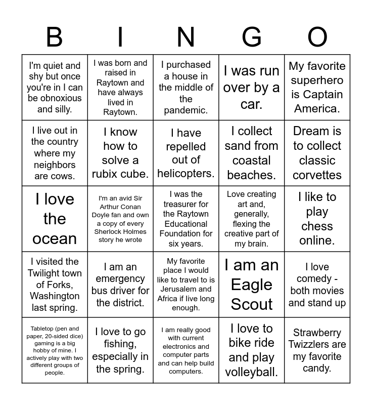 This bingo card has 28 words: I love comedy - both movies and stand up, I have 16 grandchildren (5 biological & 11 step). You could just say 16., I collect sand from coastal beaches., I love to bike ride and play volleyball., I live out in the country where my neighbors are cows., I purchased a house in the middle of the pandemic., I was born and raised in Raytown and have always lived in Raytown., I visited the Twilight town of Forks, Washington last spring., Love creating art and, generally, flexing the creative part of my brain., Tabletop (pen and paper, 20-sided dice) gaming is a big hobby of mine. I actively play with two different groups of people., I love the ocean, I was run over by a car., I love to go fishing, especially in the spring., I am really good with current electronics and computer parts and can help build computers., Dream is to collect classic corvettes, I have been to the NC500 circle in Scotland., I am an emergency bus driver for the district., I know how to solve a rubix cube., I have repelled out of helicopters., My favorite place I would like to travel to is Jerusalem and Africa if Iive long enough., I'm quiet and shy but once you're in I can be obnoxious and silly., Strawberry Twizzlers are my favorite candy., I was the treasurer for the Raytown Educational Foundation for six years., I'm an avid Sir Arthur Conan Doyle fan and own a copy of every Sherlock Holmes story he wrote, I like to play chess online., I am an Eagle Scout, My favorite superhero is Captain America. and I've been to over 150 concerts..