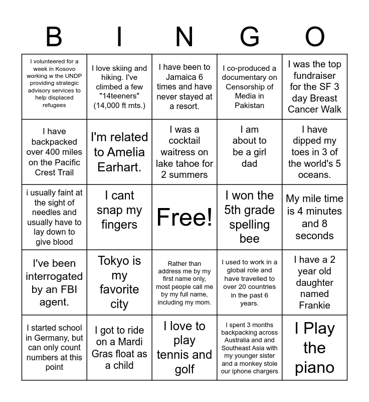 This bingo card has a free space and 29 words: I started school in Germany, but can only count numbers at this point, I can clap with one hand, I cant snap my fingers, I like old school rap music, I volunteered for a week in Kosovo working w the UNDP providing strategic advisory services to help displaced refugees, I have been to Jamaica 6 times and have never stayed at a resort., I'm related to Amelia Earhart., Tokyo is my favorite city, I won the 5th grade spelling bee, I got to ride on a Mardi Gras float as a child, My mile time is 4 minutes and 8 seconds, I Play the piano, I love to play tennis and golf, I spent 3 months backpacking across Australia and and Southeast Asia with my younger sister and a monkey stole our iphone chargers, I have dipped my toes in 3 of the world's 5 oceans., I make a mean guacamole!, Rather than address me by my first name only, most people call me by my full name, including my mom., I've been interrogated by an FBI agent., I was the top fundraiser for the SF 3 day Breast Cancer Walk, i usually faint at the sight of needles and usually have to lay down to give blood, I used to work in a global role and have travelled to over 20 countries in the past 6 years., My childhood dog got picked up by a hawk (but luckily he survived), I am about to be a girl dad, I have backpacked over 400 miles on the Pacific Crest Trail, I co-produced a documentary on Censorship of Media in Pakistan, I love skiing and hiking. I've climbed a few "14teeners" (14,000 ft mts.), I have a 2 year old daughter named Frankie, I was a cocktail waitress on lake tahoe for 2 summers and I grew up in Los Angeles.