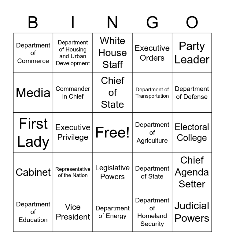 This bingo card has a free space and 37 words: Qualifications, Benefits, Chief Executive, Commander in Chief, Chief Agenda Setter, Representative of the Nation, Chief of State, Foreign Policy Leader, Party Leader, Appointing Officials, Executive Privilege, Executive Orders, Judicial Powers, Electoral College, Media, Cabinet, Executive Office, White House Staff, Legislative Powers, Department of Agriculture, Department of Commerce, Department of Defense, Department of Education, Department of Energy, Department of Health and Human Services, Department of Homeland Security, Department of Housing and Urban Development, Department of the Interior, Department of Justice, Department of Labor, Department of Veterans Affairs, Vice President, First Lady, Bureaucracy, Department of State, Department of Transportation and Department of the Treasury.