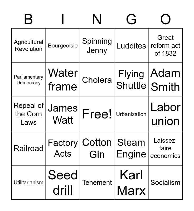 This bingo card has a free space and 30 words: Seed drill, Enclosure movement, James Watt, Cottage Industry, Agricultural Revolution, Spinning Jenny, Water frame, Cotton Gin, Urbanization, Tenement, Labor union, Socialism, Karl Marx, Proletariat, Adam Smith, Textile, Steam Engine, Railroad, Factory Acts, Great reform act of 1832, Repeal of the Corn Laws, Chartists, Bourgeoisie, Flying Shuttle, Parliamentary Democracy, Luddites, Laissez-faire economics, Utilitarianism, Cholera and Robert Owen.