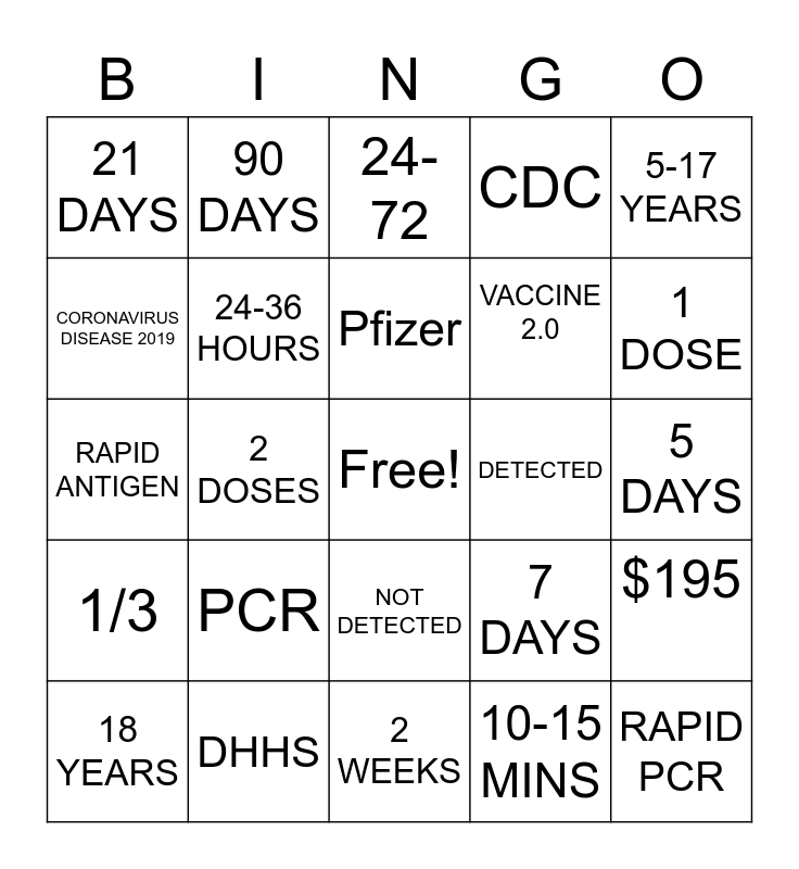 This bingo card has a free space and 24 words: PCR, DHHS, Pfizer, 18 YEARS, 5-17 YEARS, 21 DAYS, CORONAVIRUS DISEASE 2019, 90 DAYS, DETECTED, NOT DETECTED, VACCINE 2.0, RAPID ANTIGEN, 7 DAYS, $195, 24-36 HOURS, 10-15 MINS, 5 DAYS, 24-72, 1 DOSE, 2 DOSES, RAPID PCR, 1/3, CDC and 2 WEEKS.