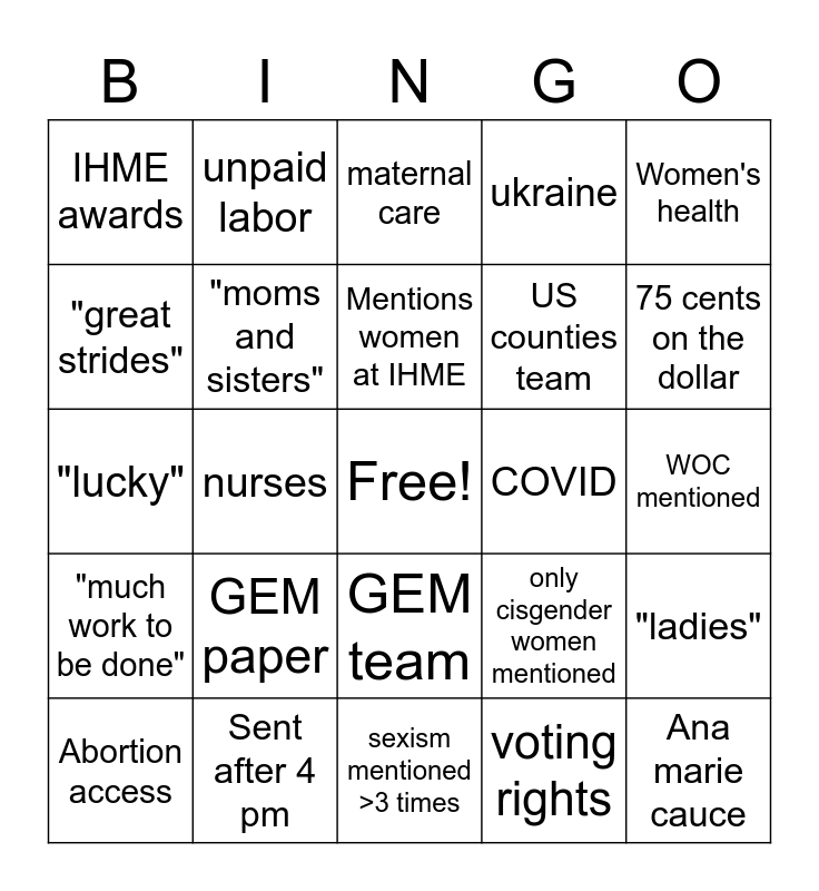 This bingo card has a free space and 24 words: GEM paper, Sent after 4 pm, Mentions women at IHME, Abortion access, Women's health, IHME awards, "great strides", unpaid labor, COVID, GEM team, US counties team, "lucky", only cisgender women mentioned, "ladies", "moms and sisters", voting rights, WOC mentioned, maternal care, 75 cents on the dollar, nurses, Ana marie cauce, "much work to be done", ukraine and sexism mentioned >3 times.