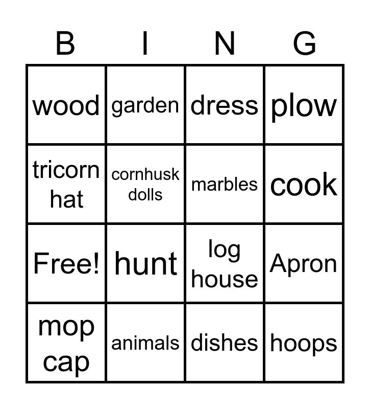 This bingo card has 20 words: Apron, eggs, dress, breeches, mop cap, tricorn hat, animals, wood, Free!, garden, hunt, log house, cornhusk dolls, hoops, marbles, dice, cook, plow, dishes and build furniture.