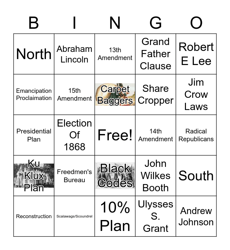 This bingo card has 3 images, a free space and 24 words: Freedmen's Bureau, Scalawags/Scoundrel, Carpet Baggers, Reconstruction, Robert E Lee, North, Emancipation Proclaimation, Abraham Lincoln, 14th Amendment, Black Codes, Share Cropper, Presidential Plan, John Wilkes Booth, South, 15th Amendment, Ulysses S. Grant, Radical Republicans, 13th Amendment, Jim Crow Laws, Election Of 1868, Andrew Johnson, Ku Klux Plan, Grand Father Clause and 10% Plan.
