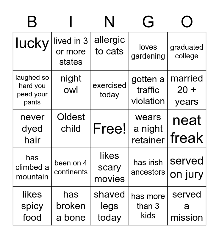 This bingo card has a free space and 29 words: likes spicy food, can touch nose with tongue, Oldest child, speaks another language, lucky, allergic to cats, night owl, been on 4 continents, wears a night retainer, has broken a bone, neat freak, served a mission, shaved legs today, has more than 3 kids, married 20 + years, left handed, likes scary movies, has climbed a mountain, graduated college, never dyed hair, has irish ancestors, wears glasses, gotten a traffic violation, laughed so hard you peed your pants, loves gardening, lived in 3 or more states, served on jury, exercised today and has read 3 or more books this month.