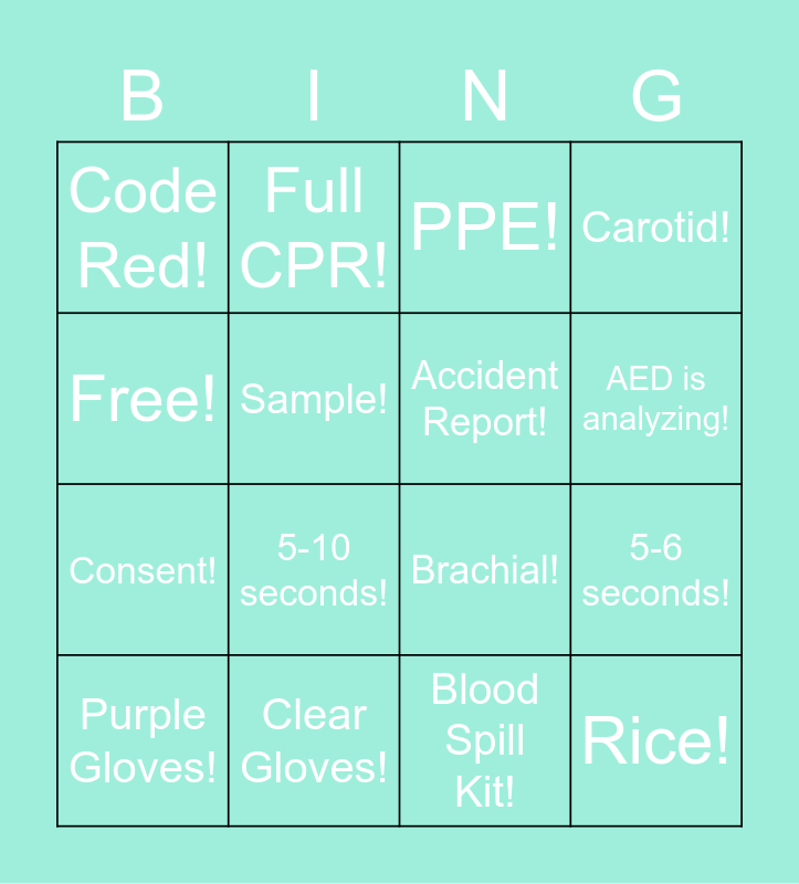 This bingo card has 16 words: Clear Gloves!, 5-6 seconds!, PPE!, Code Red!, Consent!, Full CPR!, Brachial!, Blood Spill Kit!, Free!, Sample!, Purple Gloves!, Carotid!, 5-10 seconds!, AED is analyzing!, Accident Report! and Rice!.