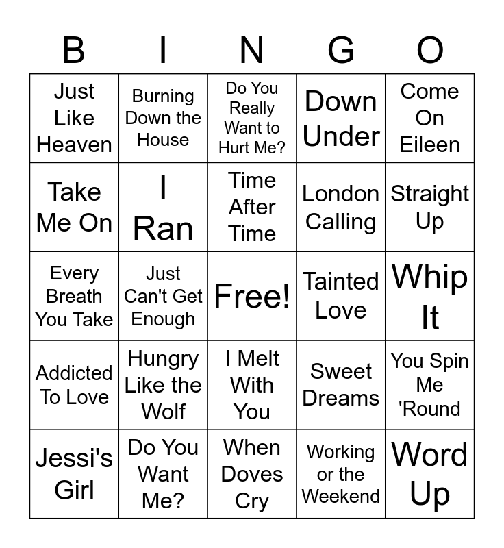 This bingo card has a free space and 25 words: Hungry Like the Wolf, When Doves Cry, Time After Time, Jessi's Girl, Come On Eileen, Just Like Heaven, Take Me On, Burning Down the House, Tainted Love, I Melt With You, London Calling, Every Breath You Take, Sweet Dreams, You Spin Me 'Round, I Ran, Total Eclipse of the Heart, Whip It, Do You Really Want to Hurt Me?, Straight Up, Just Can't Get Enough, Word Up, Do You Want Me?, Addicted To Love, Down Under and Working or the Weekend.