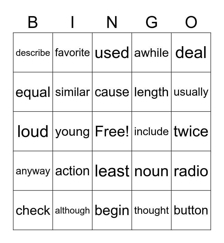 This bingo card has a free space and 24 words: action, although, cause, check, deal, describe, equal, favorite, include, least, length, loud, noun, radio, similar, thought, twice, used, usually, young, button, anyway, awhile and begin.