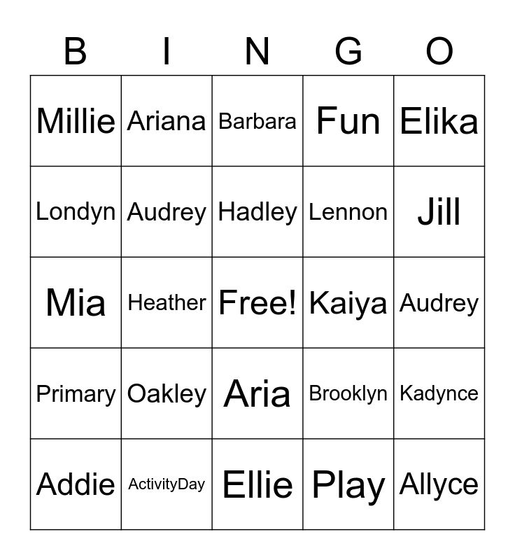 This bingo card has a free space and 25 words: Oakley, Ellie, Hadley, Addie, Elika, Millie, Londyn, Ariana, Kaiya, Aria, Lennon, Mia, Brooklyn, Kadynce, Audrey, Christianna, Audrey, Barbara, Jill, Heather, Allyce, ActivityDay, Primary, Fun and Play.