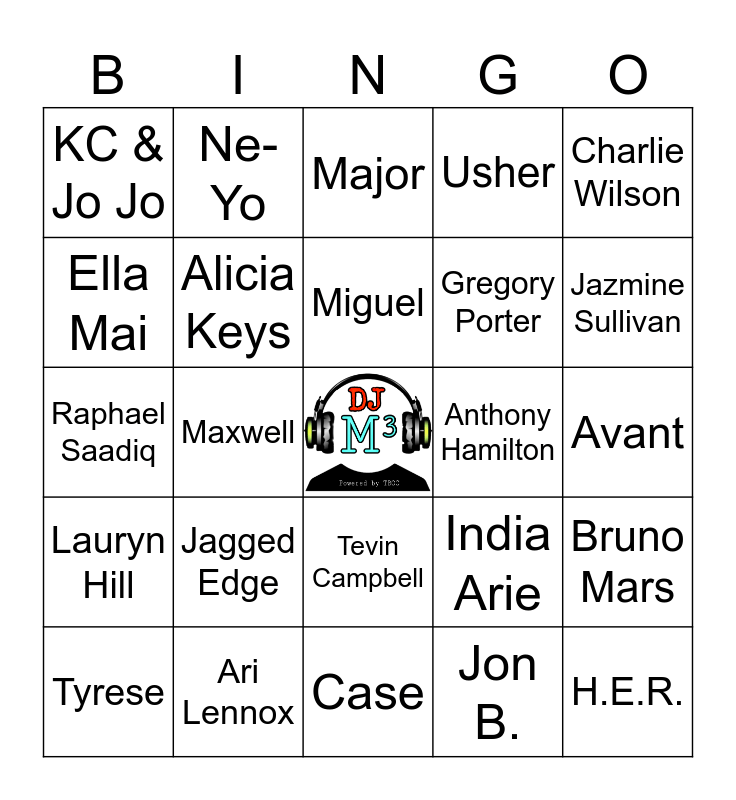 This bingo card has a free space and 24 words: Jagged Edge, Ari Lennox, Miguel, Tyrese, Charlie Wilson, KC & Jo Jo, Ella Mai, Ne-Yo, Anthony Hamilton, Tevin Campbell, Gregory Porter, Raphael Saadiq, India Arie, Bruno Mars, Alicia Keys, Jon B., Avant, Major, Jazmine Sullivan, Maxwell, H.E.R., Lauryn Hill, Usher and Case.