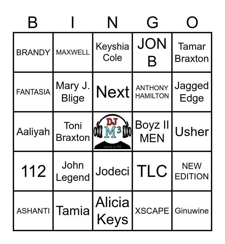 This bingo card has a free space and 34 words: MARIAH CAREY, XSCAPE, Dru Hill, SWV, 112, Mary J. Blige, Tamar Braxton, ASHANTI, MAXWELL, NE-YO, Next, Keyshia Cole, BEYONCE, RIHANNA, Boyz II MEN, Jagged Edge, Tamia, Aaliyah, John Legend, TLC, Jodeci, MONICA, BRANDY, Usher, Alicia Keys, Ginuwine, JON B, R.Kelly, ANTHONY HAMILTON, FANTASIA, MUSIQ SOULCHILD, Toni Braxton, NEW EDITION and Darnell Jones.