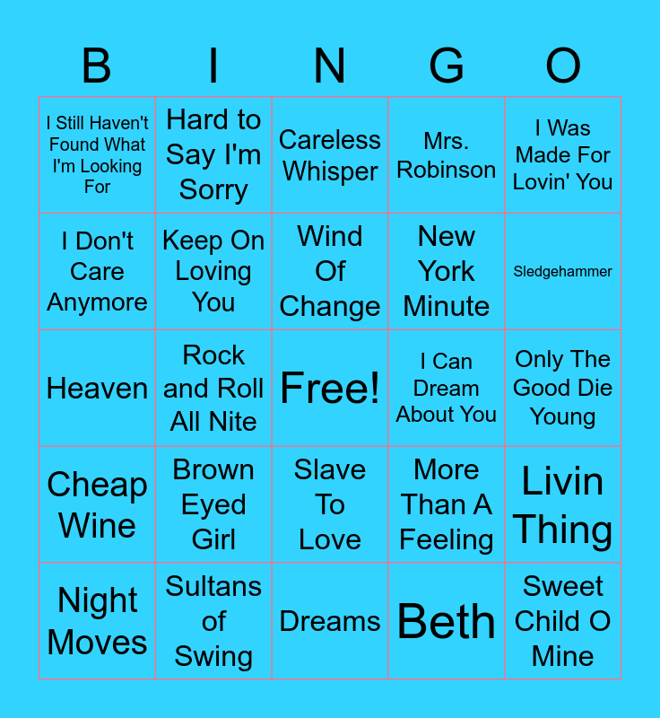This bingo card has a free space and 49 words: The Boys Of Summer, Sweet Child O Mine, Africa, Dreams, Brown Eyed Girl, Crazy Love, Hard to Say I'm Sorry, (Don't Fear) The Reaper, I Don't Care Anymore, Higher Love, Keep On Loving You, Mrs. Robinson, Livin Thing, More Than A Feeling, Losing My Religion, Everybody Wants To Rule The World, Wind Of Change, I Can Dream About You, Glory Of Love, I Was Made For Lovin' You, Rock and Roll All Nite, Beth, I Still Haven't Found What I'm Looking For, New York Minute, Time After Time, Sledgehammer, Night Moves, Have You Ever Seen The Rain, Slave To Love, Cheap Wine, True, Landslide, The Chain, September, Sultans of Swing, Jack and Diane, Don't You (Forget About Me), Hurts So Good, Only The Good Die Young, Spirit In The Sky, Drive, Invisible Touch, Baby, I Love Your Way, The Logical Song, Heaven, Careless Whisper, How Deep Is Your Love, Crazy and Sir Duke.
