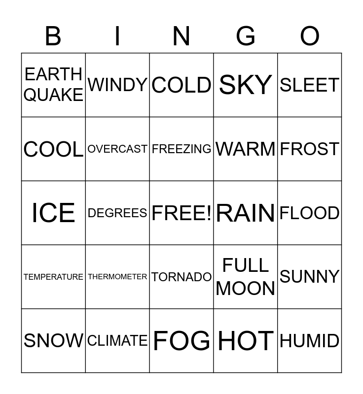 This bingo card has a free space and 28 words: SUNNY, CLOUDY, WARM, HOT, COOL, COLD, WINDY, TEMPERATURE, RAIN, SNOW, ICE, SKY, CLIMATE, FOG, FROST, STORM, THERMOMETER, OVERCAST, FREEZING, TORNADO, EARTH QUAKE, HURRICANE, HUMID, DEGREES, FLOOD, FULL MOON, SLEET and SUN.