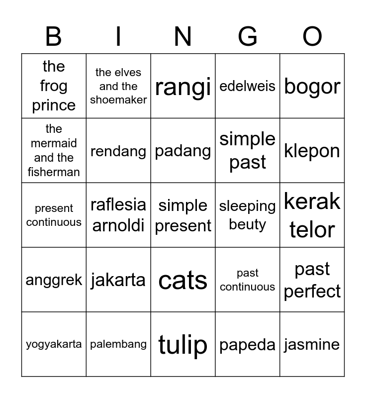 This bingo card has a free space and 24 words: jakarta, palembang, padang, yogyakarta, bogor, the frog prince, the mermaid and the fisherman, the elves and the shoemaker, sleeping beuty, cats, simple past, present continuous, past continuous, past perfect, rendang, papeda, kerak telor, rangi, klepon, raflesia arnoldi, jasmine, anggrek, edelweis and tulip.