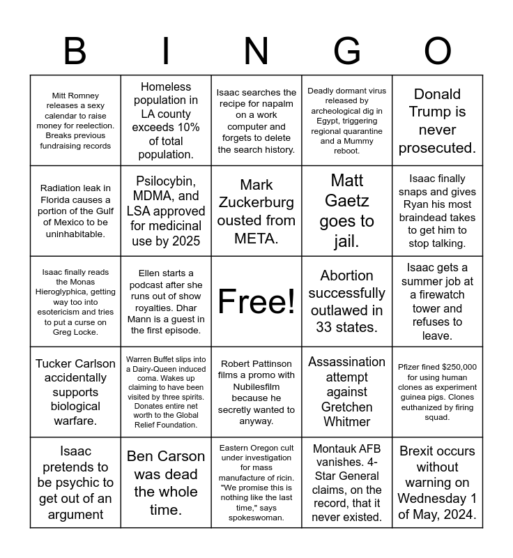 This bingo card has a free space and 29 words: Isaac pretends to be psychic to get out of an argument, UAP crash landing triggers national media firestorm. Officials don't even try to come up with a valid excuse., Ellen starts a podcast after she runs out of show royalties. Dhar Mann is a guest in the first episode., Alcubierre drive prorotype built by USAF. Accidentally switched on by careless intern, 10 sq miles of Nebraskan wilderness spaghettified., Mitt Romney releases a sexy calendar to raise money for reelection. Breaks previous fundraising records, Isaac searches the recipe for napalm on a work computer and forgets to delete the search history., Psilocybin, MDMA, and LSA approved for medicinal use by 2025, Warren Buffet slips into a Dairy-Queen induced coma. Wakes up claiming to have been visited by three spirits. Donates entire net worth to the Global Relief Foundation., Abortion successfully outlawed in 33 states., Ben Carson was dead the whole time., Isaac gets a summer job at a firewatch tower and refuses to leave., Brexit occurs without warning on Wednesday 1 of May, 2024., Eastern Oregon cult under investigation for mass manufacture of ricin. "We promise this is nothing like the last time," says spokeswoman., Montauk AFB vanishes. 4-Star General claims, on the record, that it never existed., Isaac finally snaps and gives Ryan his most braindead takes to get him to stop talking., Trump does not win the 2024 presidential election. Dies shortly afterward., Robert Pattinson films a promo with Nubilesfilm because he secretly wanted to anyway., Tucker Carlson accidentally supports biological warfare., Donald Trump is never prosecuted., Isaac finally reads the Monas Hieroglyphica, getting way too into esotericism and tries to put a curse on Greg Locke., Assassination attempt against Gretchen Whitmer, Elon Musk builds a Gonk Droid and sells it for $14,000. It is functionless., Matt Gaetz goes to jail., Radiation leak in Florida causes a portion of the Gulf of Mexico to be uninhabitable., Deadly dormant virus released by archeological dig in Egypt, triggering regional quarantine and a Mummy reboot., Homeless population in LA county exceeds 10% of total population., Pfizer fined $250,000 for using human clones as experiment guinea pigs. Clones euthanized by firing squad., Mark Zuckerburg ousted from META. and Hank Smith gets a sunburn so bad he wears a compression mask to a speaking event..