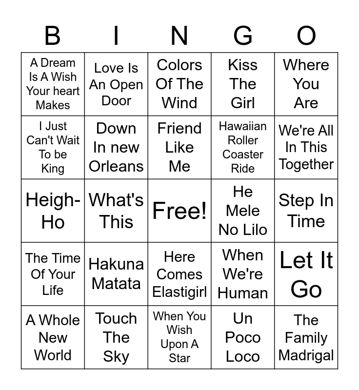 This bingo card has a free space and 53 words: You're Welcome, The Family Madrigal, Into The Unknown, Un Poco Loco, Hakuna Matata, Nobody Like U, Love Is An Open Door, Be Our Guest, I Just Can't Wait To be King, Part Of Your World, Down In new Orleans, I'll Make A Man Out Of You, Let It Go, When We're Human, Loyal Brave True, A Whole New World, Friend Like Me, He Mele No Lilo, Zero To Hero, Where You Are, What's This, For The First Time In Forever, Hawaiian Roller Coaster Ride, A Dream Is A Wish Your heart Makes, Try Everything, Touch The Sky, Mother Knows Best, A Girl Worth Fighting For, Under The Sea, We're All In This Together, The Bare necessities, 121, Supercalifragilistic...., One Jump Ahead, Immortals, You've Got A Friend In me, Kiss The Girl, When You Wish Upon A Star, Colors Of The Wind, Trashin' The Camp, Beauty & The Beast, A Spoonful of Sugar, Step In Time, Hands Up Cash Out, Prince Ali, Here Comes Elastigirl, It's A Small World, If I Didn't Have You, Heigh-Ho, The Time Of Your Life, Get'cha Head In The Game, Bop To The Top and I Don't Dance.