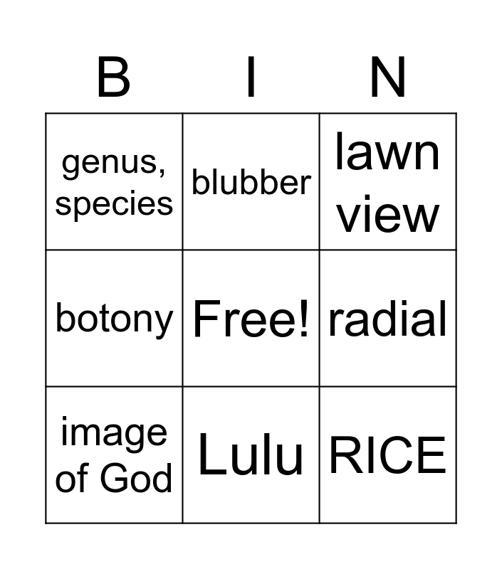 This bingo card has a free space and 8 words: radial, lawn view, blubber, image of God, genus, species, RICE, botony and Lulu.