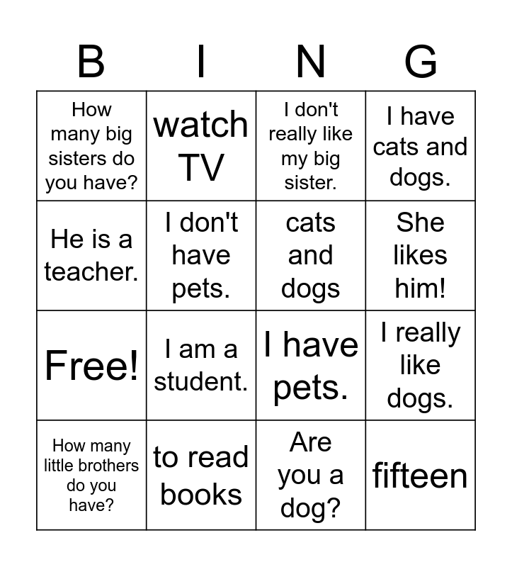 This bingo card has 20 words: I really like dogs., Do you have a dog?, I don't really like my big sister., We like you., How many little brothers do you have?, He is a teacher., to read books, How many big sisters do you have?, Free!, watch TV, I am a student., I have pets., I don't have pets., fifteen, cats and dogs, I like cats but not dogs., She likes him!, I have cats and dogs., Are you a dog? and His name is Xiaoming..