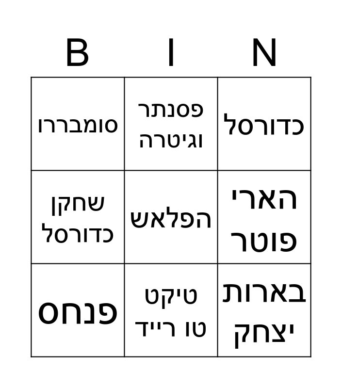 This bingo card has 16 words: Free!, חשוון, כדורסל, סומבררו, בארות יצחק, פסנתר וגיטרה, השקד, אילת, הפלאש, הארי פוטר, מילווקי באקס, שחקן כדורסל, אנגלית, טיקט טו רייד, פנחס and קולה.
