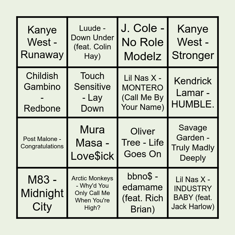This bingo card has 62 words: Rockwell - Somebody's Watching Me, Glass Animals - Heat Waves, The Kid LAROI - STAY (with Justin Bieber), Lil Nas X - INDUSTRY BABY (feat. Jack Harlow), Grover Washington, Jr. - Just the Two of Us (feat. Bill Withers), Kid Cudi - Day 'N' Nite (Nightmare), Lil Nas X - MONTERO (Call Me By Your Name), Client Liaison - World Of Our Love, Post Malone - Congratulations, Kendrick Lamar - King Kunta, Kanye West - Stronger, Nelly Furtado - Maneater, Touch Sensitive - Lay Down, Gang of Youths - Magnolia, Chet Faker - Talk Is Cheap, Kanye West - Runaway, M83 - Midnight City, Childish Gambino - Redbone, Disclosure - Latch, Kendrick Lamar - HUMBLE., Arctic Monkeys - Why'd You Only Call Me When You're High?, J. Cole - No Role Modelz, Rex Orange County - Loving Is Easy, THE ANXIETY - Meet Me At Our Spot, The Weeknd - Blinding Lights, Riton - Friday (feat. Mufasa & Hypeman) - Dopamine Re-Edit, Justin Bieber - Peaches (feat. Daniel Caesar & Giveon), Far East Movement - Like A G6, Genesis Owusu - Good Times, Elton John - Cold Heart - PNAU Remix, ACRAZE - Do It To It, Frank Ocean - Lost, Yothu Yindi - Treaty, Doja Cat - Need to Know, bbno$ - edamame (feat. Rich Brian), Luude - Down Under (feat. Colin Hay), The Wiggles - Elephant - triple j Like A Version, Mac Miller - The Spins, Savage Garden - Truly Madly Deeply, Rod Stewart - Da Ya Think I'm Sexy?, Oliver Tree - Life Goes On, A-Wall - Loverboy, Disclosure - You & Me - Flume Remix, Majestic - Rasputin, Mura Masa - Love$ick, The Wombats - Greek Tragedy - Oliver Nelson TikTok Remix, Faith No More - Easy, Stardust - Music Sounds Better With You, Daryl Hall & John Oates - You Make My Dreams (Come True), ABBA - Dancing Queen, Vance Joy - Riptide, The Presets - Downtown Shutdown, Frank Ocean - Chanel, NEIL FRANCES - Music Sounds Better with You, Flume - The Difference, Spacey Jane - Lots of Nothing, Estelle - American Boy, Glass Animals - Heat Waves (with iann dior), Bruno Mars - Smokin Out The Window, The Weeknd - Take My Breath, Kim Carnes - Bette Davis Eyes and Metro Station - Shake It.