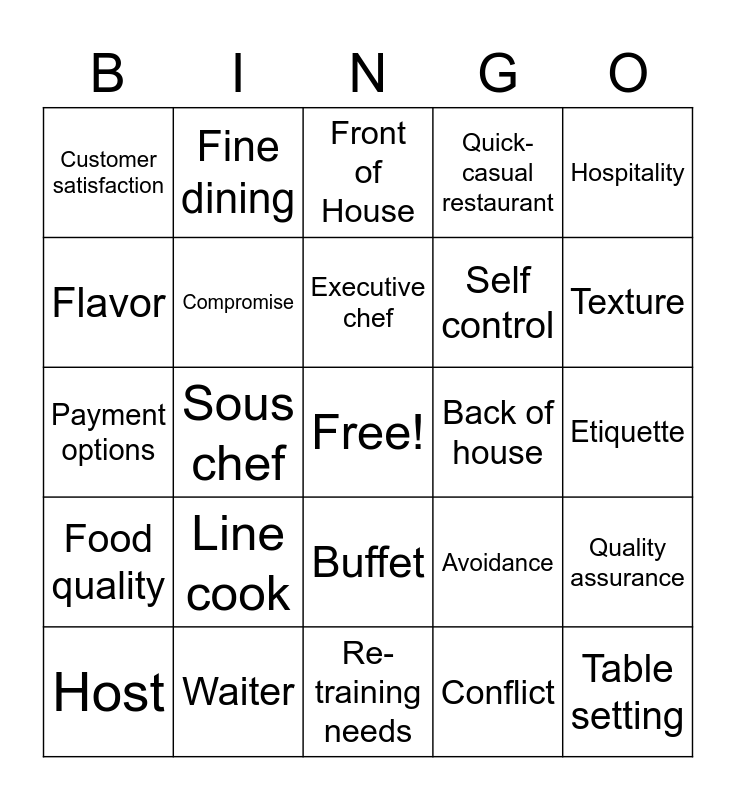 This bingo card has a free space and 24 words: Host, Line cook, Executive chef, Conflict, Hospitality, Customer satisfaction, Fine dining, Front of House, Back of house, Etiquette, Payment options, Compromise, Avoidance, Quality assurance, Flavor, Waiter, Re-training needs, Quick-casual restaurant, Texture, Food quality, Sous chef, Buffet, Self control and Table setting.