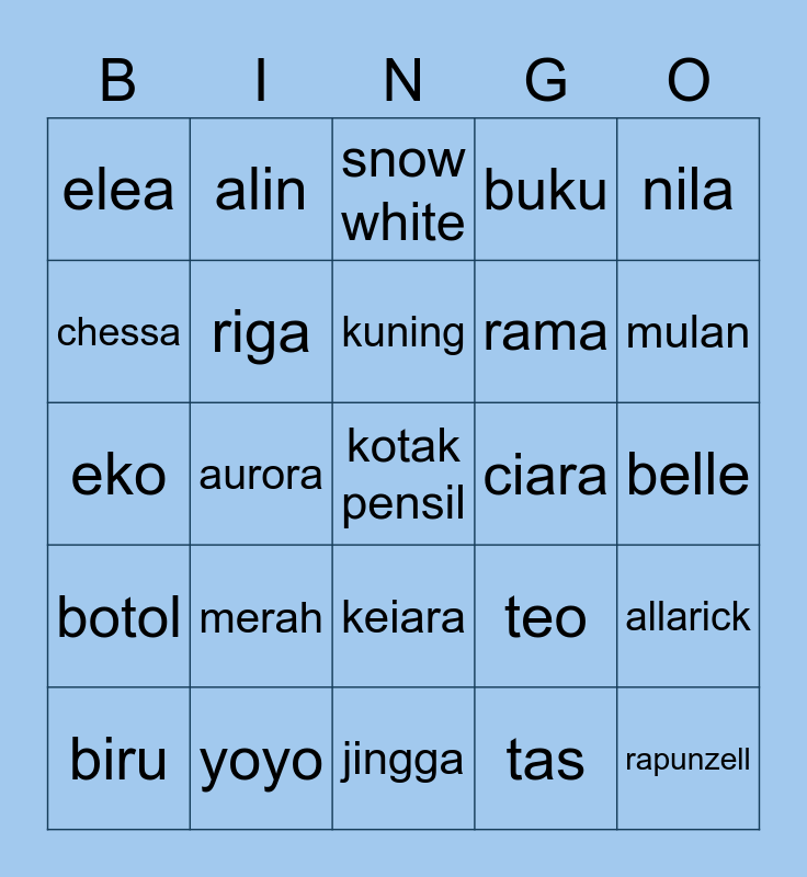 This bingo card has 25 words: merah, jingga, kuning, biru, nila, elea, chessa, alin, ciara, keiara, rama, eko, teo, allarick, riga, rapunzell, belle, snow white, mulan, aurora, kotak pensil, yoyo, botol, buku and tas.