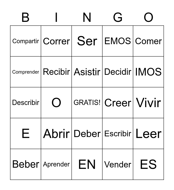 This bingo card has a free space and 24 words: Abrir, Aprender, Asistir, Beber, Comer, Compartir, Comprender, Correr, Creer, Deber, Decidir, Describir, Escribir, Leer, Recibir, Vender, Vivir, Ser, IMOS, O, ES, E, EMOS and EN.