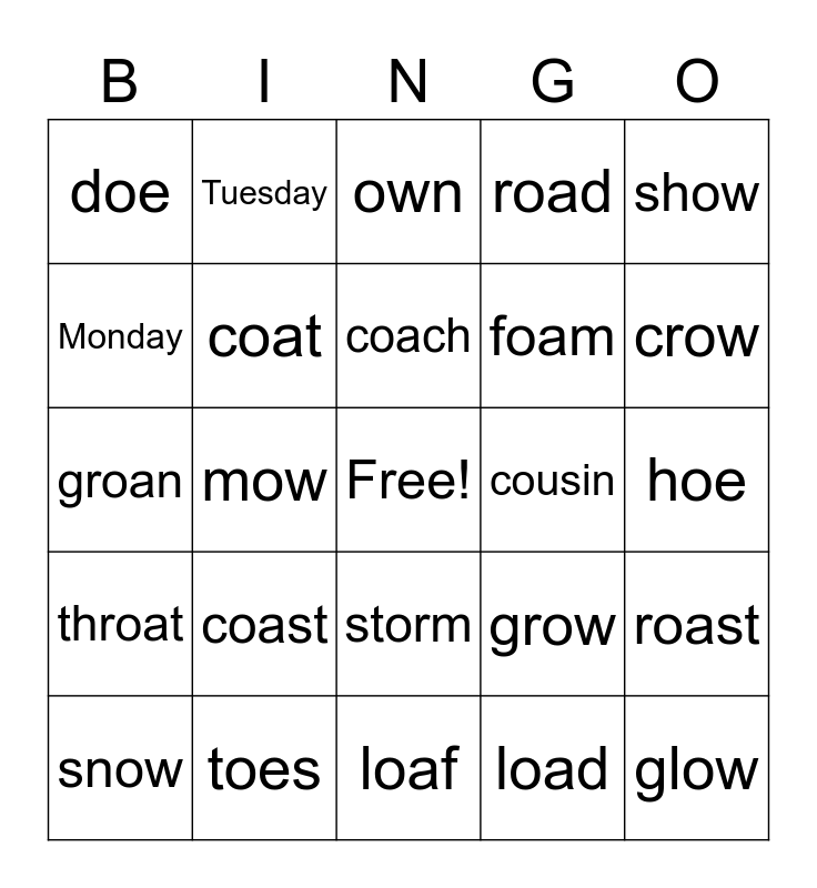 This bingo card has a free space and 24 words: coast, toes, coach, snow, show, doe, Monday, Tuesday, cousin, storm, foam, groan, grow, roast, coat, load, hoe, own, crow, mow, glow, throat, road and loaf.