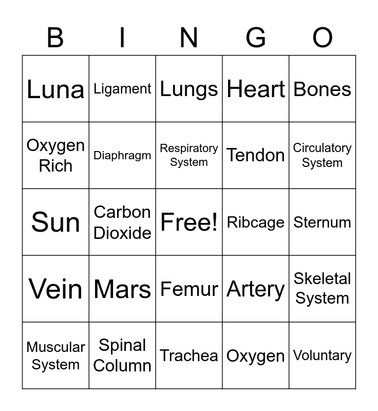 This bingo card has a free space and 30 words: Spinal Column, Fuse, Carbon Dioxide, Circulatory, Luna, Lungs, Diaphragm, Femur, Ribcage, Trachea, Sternum, Voluntary, Oxygen, Involuntary, Circulatory System, Muscles, Artery, Vein, Mars, Bones, Sun, Oxygen cannot be stored, Ligament, Tendon, Oxygen Rich, Heart, Skeletal System, Muscular System, Respiratory System and Vertebrae.