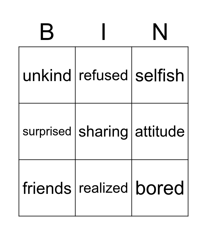 This bingo card has a free space and 8 words: attitude, selfish, refused, friends, unkind, bored, surprised and realized.