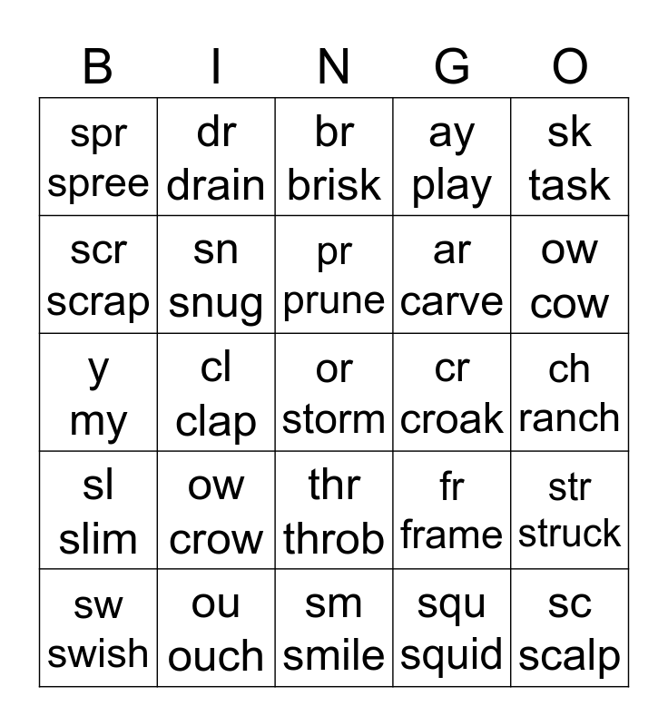 This bingo card has 25 words: ow crow, sm smile, pr prune, sw swish, sk task, spr spree, scr scrap, dr drain, cr croak, thr throb, ar carve, y my, fr frame, str struck, sn snug, sc scalp, ch ranch, br brisk, ow cow, cl clap, or storm, ou ouch, sl slim, ay play and squ squid.