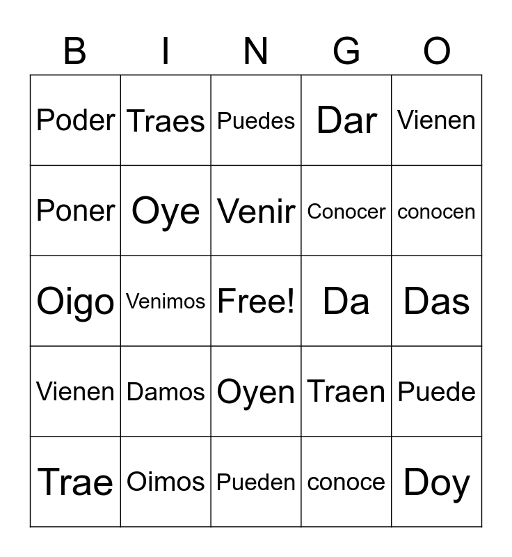 This bingo card has a free space and 41 words: Oir, Oigo, Oyes, Oye, Oimos, Oyen, Venir, Vienes, Vienen, Vienen, Venimos, Dar, Doy, Das, Da, Damos, Dan, Poder, Puedo, Puedes, Puede, Podemos, Pueden, Conocer, Conozco, Conoces, conoce, concocimos, conocen, Traer, Traigo, Traes, Trae, Traemos, Traen, Poner, Pongo, Pones, Pone, Ponemos and Ponen.