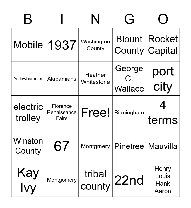 This bingo card has a free space and 24 words: 67, Montgomery, Heather Whitestone, Kay Ivy, Rocket Capital, Mobile, Yellowhammer, 1937, Birmingham, Montgmery, George C. Wallace, electric trolley, Pinetree, Mauvilla, Alabamians, 22nd, 4 terms, Washington County, port city, Florence Renaissance Faire, Henry Louis Hank Aaron, Winston County, Blount County and tribal county.