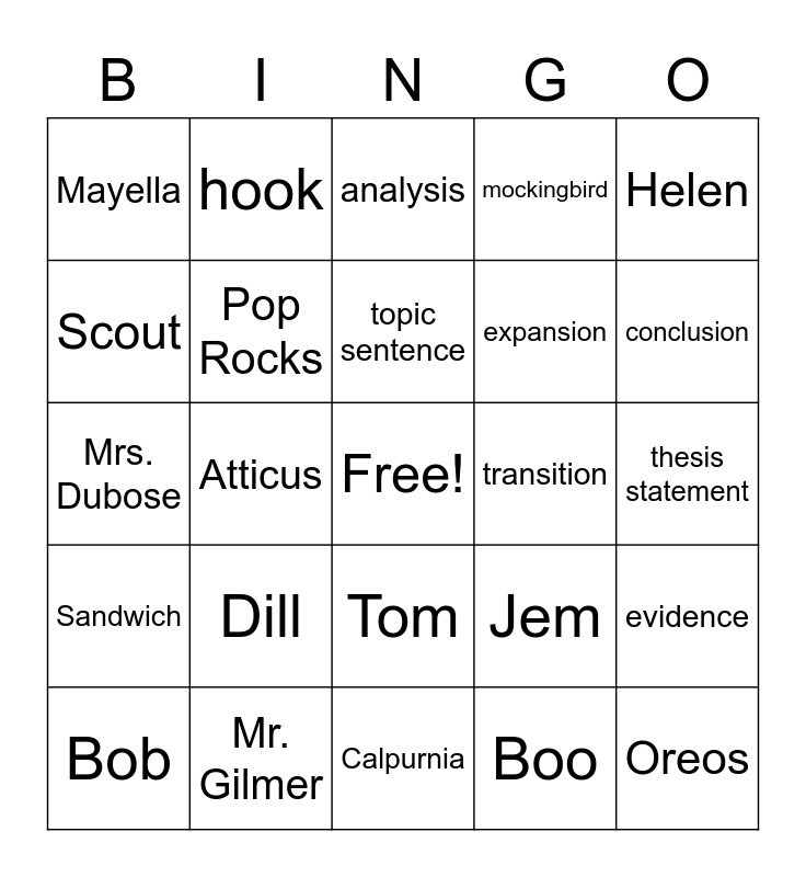 This bingo card has a free space and 24 words: Dill, Mr. Gilmer, topic sentence, Bob, Helen, Mayella, Scout, hook, transition, Tom, expansion, Mrs. Dubose, Jem, evidence, Pop Rocks, Boo, thesis statement, analysis, conclusion, Atticus, Oreos, Sandwich, mockingbird and Calpurnia.