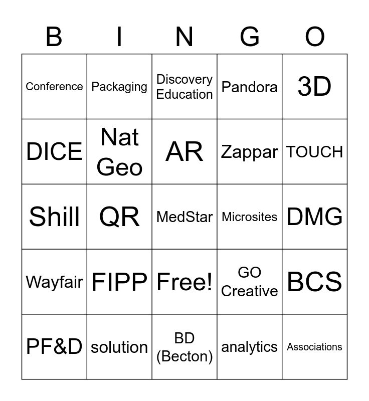 This bingo card has 26 words: Free!, analytics, AR, solution, 3D, Conference, DICE, Packaging, DMG, GO Creative, Zappar, Shill, BCS, PF&D, QR, Geo-Fence, Pandora, Wayfair, Discovery Education, MedStar, TOUCH, BD (Becton), Microsites, FIPP, Nat Geo and Associations.