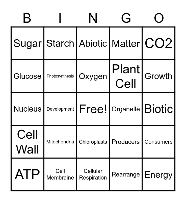 This bingo card has a free space and 24 words: Mitochondria, Cell Membraine, Oxygen, ATP, CO2, Sugar, Glucose, Starch, Organelle, Chloroplasts, Plant Cell, Nucleus, Producers, Consumers, Photosynthesis, Rearrange, Biotic, Abiotic, Growth, Development, Energy, Cell Wall, Matter and Cellular Respiration.