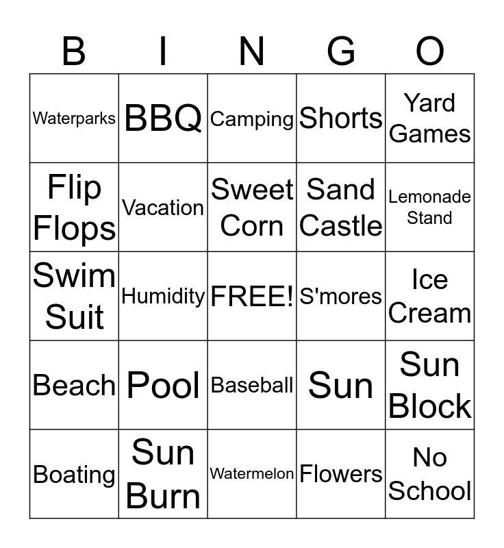 This bingo card has a free space and 30 words: Sun Burn, Lightening Bugs, Humidity, Bug Spray, Waterparks, Camping, Vacation, Baseball, S'mores, Watermelon, Ice Cream, No School, Flowers, Bike Ride, Lemonade Stand, Grilling Out, Sun, Beach, Pool, Yard Games, Swim Suit, Picnic, BBQ, Sand Castle, Flip Flops, Shorts, Sun Block, Boating, Sweet Corn and Butterflies.