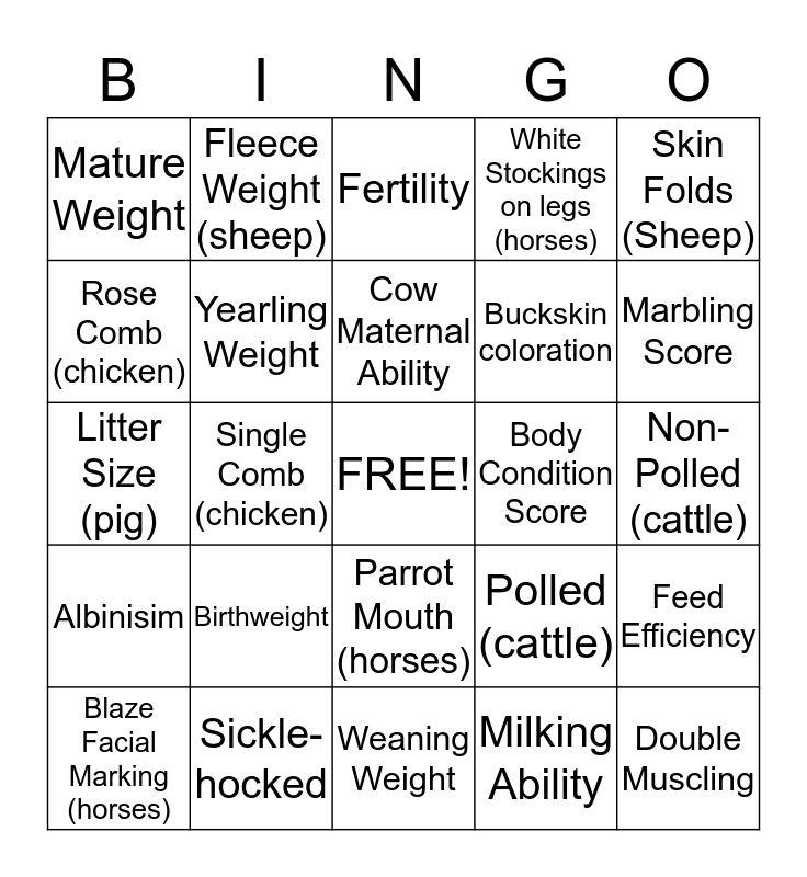 This bingo card has a free space and 24 words: Birthweight, Sickle-hocked, Cow Maternal Ability, Blaze Facial Marking (horses), Skin Folds (Sheep), Mature Weight, Rose Comb (chicken), Fleece Weight (sheep), Body Condition Score, Parrot Mouth (horses), Buckskin coloration, Litter Size (pig), Polled (cattle), Feed Efficiency, Yearling Weight, Milking Ability, Non-Polled (cattle), Fertility, Marbling Score, Single Comb (chicken), Double Muscling, Albinisim, White Stockings on legs (horses) and Weaning Weight.