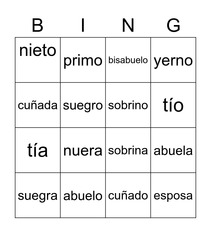 This bingo card has 16 words: abuelo, abuela, bisabuelo, nieto, tía, primo, sobrina, cuñado, cuñada, suegro, suegra, yerno, nuera, tío, sobrino and esposa.