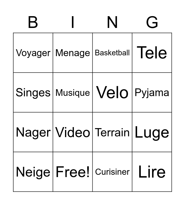 This bingo card has 16 words: Free!, Luge, Basketball, Voyager, Nager, Menage, Terrain, Curisiner, Singes, Musique, Neige, Tele, Video, Pyjama, Velo and Lire.