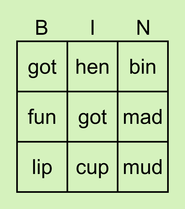 This bingo card has a free space and 8 words: mad, bin, hen, lip, got, mud, fun and cup.