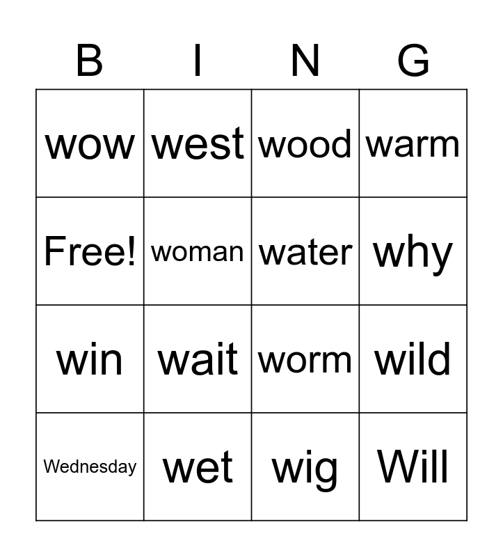 This bingo card has 16 words: wet, wild, wood, wow, win, west, worm, wig, Free!, woman, Wednesday, warm, wait, why, water and Will.