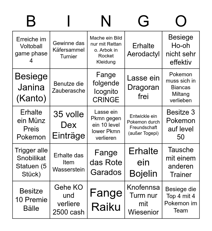 This bingo card has 25 words: Erhalte das Item Wasserstein, Fange Raiku, Fange folgende Icognito CRINGE, Besitze 10 Premie Bälle, Besiege Ho-oh nicht sehr effektiv, Erreiche im Voltoball game phase 4, Besiege Janina (Kanto), Gewinne das Käfersammel Turnier, Entwickle ein Pokemon durch Freundschaft (außer Togepi), Fange das Rote Garados, Lasse ein Dragoran frei, Erhalte ein Münz Preis Pokemon, Erhalte ein Bojelin, Tausche mit einem anderen Trainer, Benutze die Zauberasche, Besiege die Top 4 mit 4 Pokemon im Team, Besitze 3 Pokemon auf level 50, Mache ein Bild nur mit Rettan o. Arbok in Rocket Kleidung, Pokemon muss sich in Biancas Miltang verlieben, 35 volle Dex Einträge, Lasse ein Pkmn gegen ein 10 level lower Pkmn verlieren, Gehe KO und verliere 2500 cash, Trigger alle Snobilikat Statuen (5 Stück), Erhalte Aerodactyl and Knofennsa Turm nur mit Wiesenior.