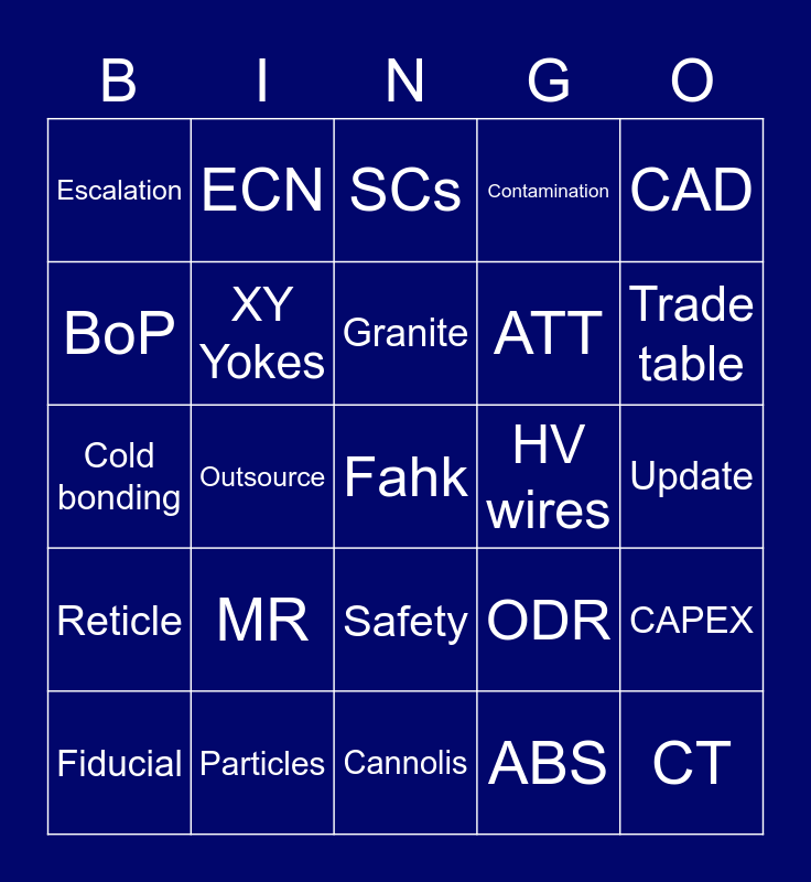 This bingo card has a free space and 24 words: MR, Particles, Granite, Fiducial, CAD, Escalation, BoP, ECN, HV wires, Safety, ATT, Cold bonding, ODR, CAPEX, XY Yokes, ABS, Update, SCs, Trade table, Outsource, CT, Reticle, Contamination and Cannolis.