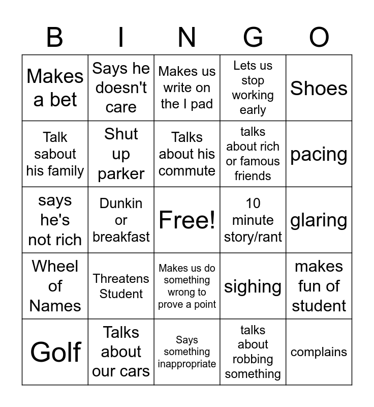 This bingo card has a free space and 24 words: Threatens Student, Talks about our cars, Talks about his commute, Golf, Shoes, Makes a bet, Talk sabout his family, Says he doesn't care, 10 minute story/rant, Makes us do something wrong to prove a point, talks about rich or famous friends, says he's not rich, sighing, makes fun of student, Shut up parker, talks about robbing something, glaring, Makes us write on the I pad, pacing, Dunkin or breakfast, complains, Wheel of Names, Lets us stop working early and Says something inappropriate.