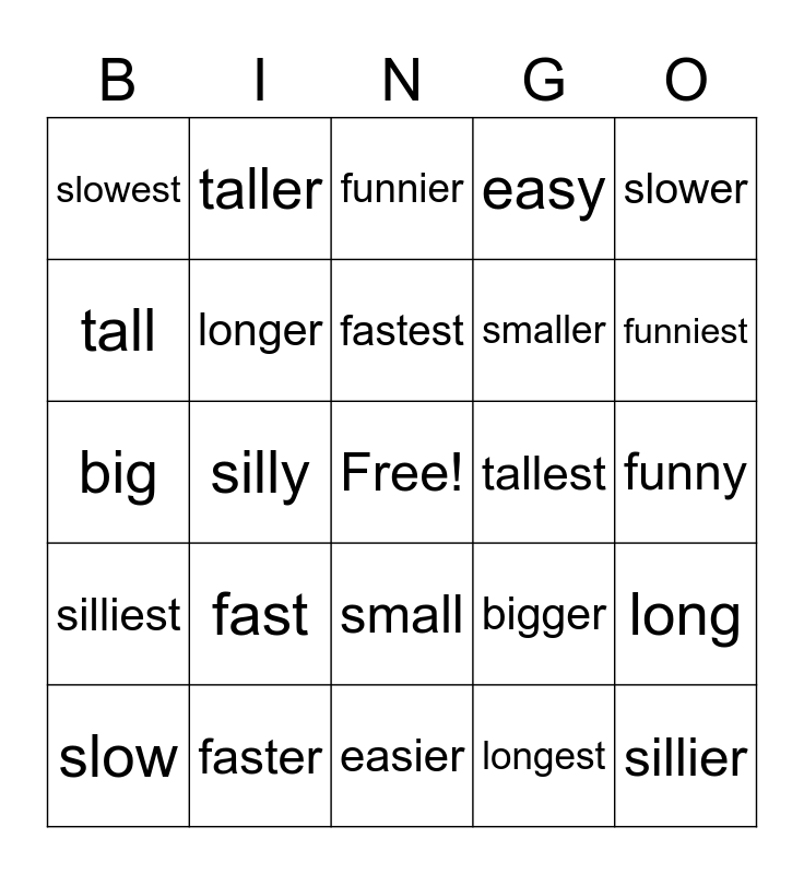 This bingo card has a free space and 24 words: fast, faster, fastest, slow, slower, slowest, tall, taller, tallest, small, smaller, big, bigger, long, longer, longest, funny, funnier, funniest, silly, sillier, silliest, easy and easier.